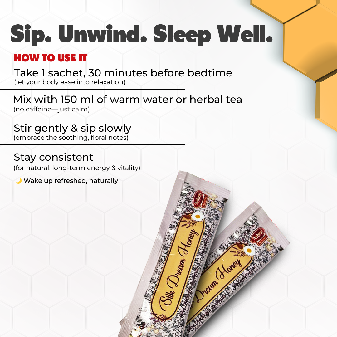 With Silk Dream Honey, you no longer need to gather ingredients or prepare complicated remedies. Each sachet offers a touch of elegance and simplicity, making relaxation an effortless part of your routine.